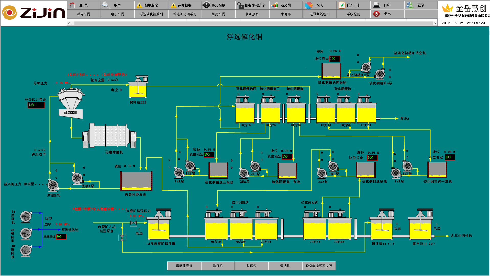 公司致力于选矿过程自动化整体解决方案,提供破碎、磨矿、选别、加药、浓缩过滤、脱水尾矿的全流程自动化控制系统的设计开发、安装调试和运行维护服务。整个工艺流程采用PLC控制系统, 仪、电、机一体化的集中化控制模式,主要生产设备采用集中控制方式。控制系统按生产管理要求规划为信息层、控制层、设备层的分布式控制网络,对成套第三方设备如球磨机控制系统、分级旋流器控制系统、浮选控制系统、浓密脱水系统等,通过通信接口与控制系统实现无缝连接。