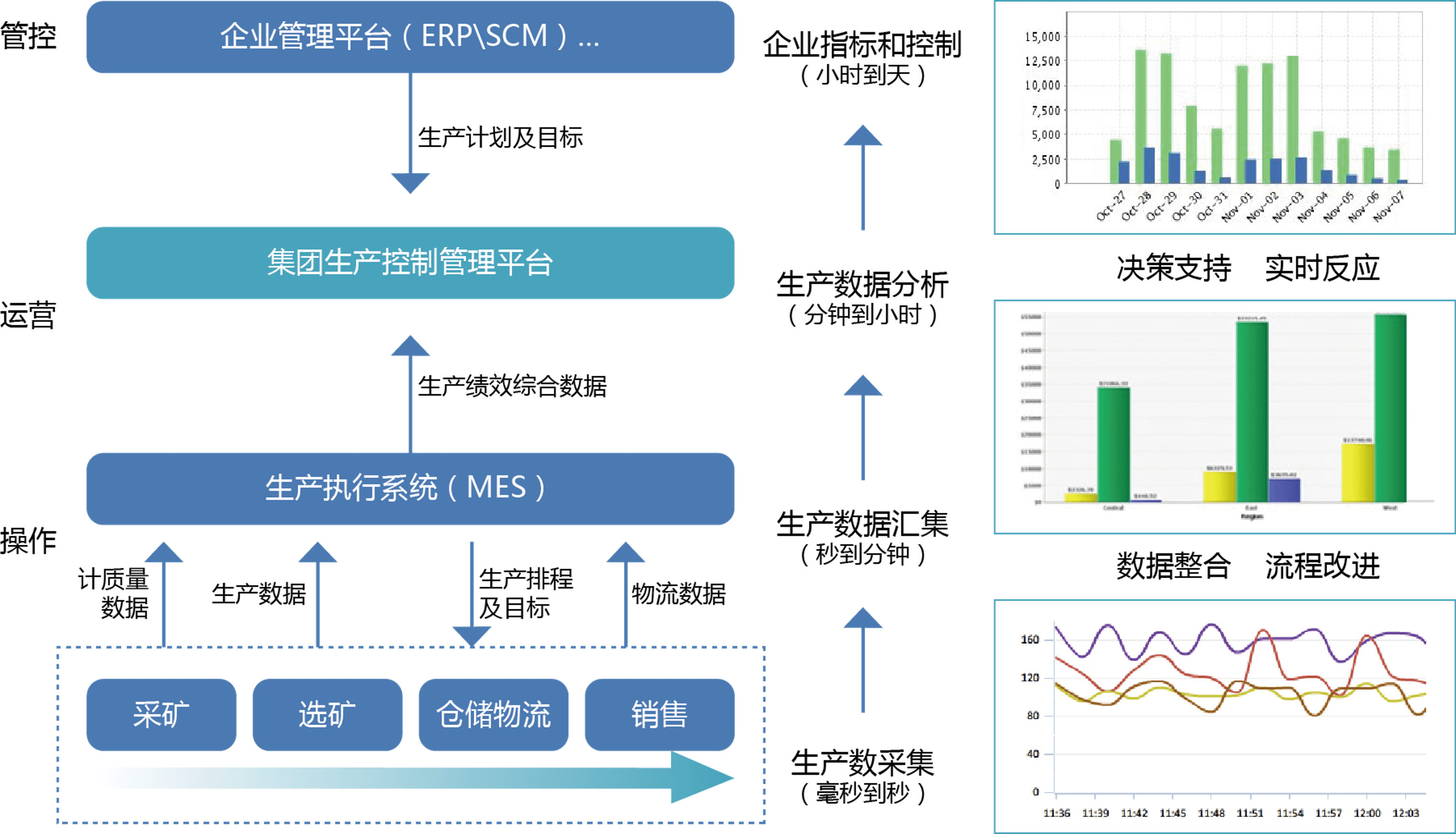 MES系统在企业的经营管理层和过程控制层之间,能够建立双向的信息交互、对生产过程进行直接控制,打通从“计划”到“调度”到“生产”的信息下达,再从“生产”到“调度”到“计划”的信息反馈。 以现有设备为基础,将数据集成技术应用到各种控制系统和监测系统,对矿山生产数据进行统一采集、集中监控、合理分析,形成一个完整的“矿山管控一体化”综合应用系统,使管理者对矿山的运营情况有全面的了解,提高矿山企业资源利用率和决策水平。