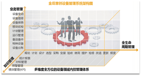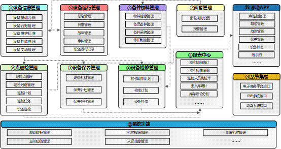金岳慧创设备管理系统主要包含设备信息管理、点巡检管理、保养管理、检修管理、设备运行管理、备件物料管理、预警管理、报表管理、系统集成、移动APP及平台功能等十一大模块。