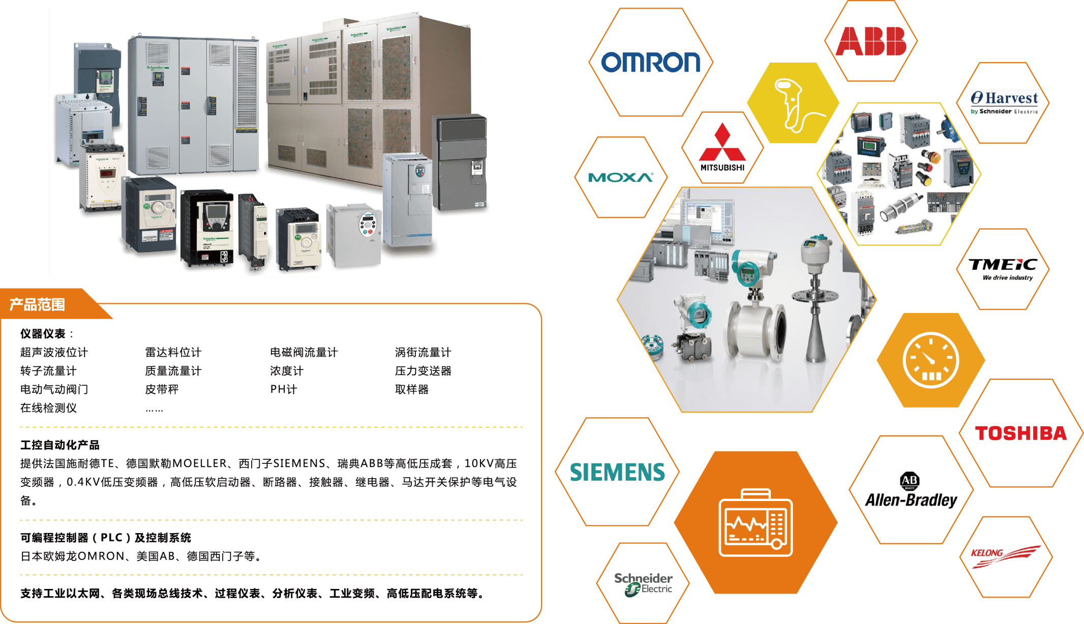 2、工控自动化产品:提供法国施耐德TE、德国默勒MOELLER、西门子SIEMENS、瑞典ABB等高低压成套,10KV高压变频器,0.4KV低压变频器,高低压软启动器、断路器、接触器、继电器、马达开关保护等电气设备。